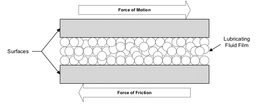 Image above shows the application of a lubricating fluid to two sliding flat surfaces.  The same principle also applies to rotating surfaces such as shafts, bearings and bushings.  Decreasing the resistance of friction through lubrication decreases the wear to sliding and rotating surfaces.  The surfaces also run cooler and require less power for operation.